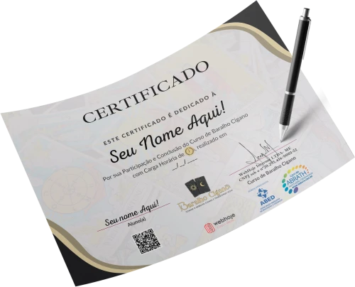 Ao finalizar o curso de Baralho Cigano, você vai baixar um certificado de conclusão válido em todo o território nacional. Este certificado não só comprova a sua dedicação e empenho, mas também valoriza o conhecimento adquirido, proporcionando uma prova concreta de sua qualificação.